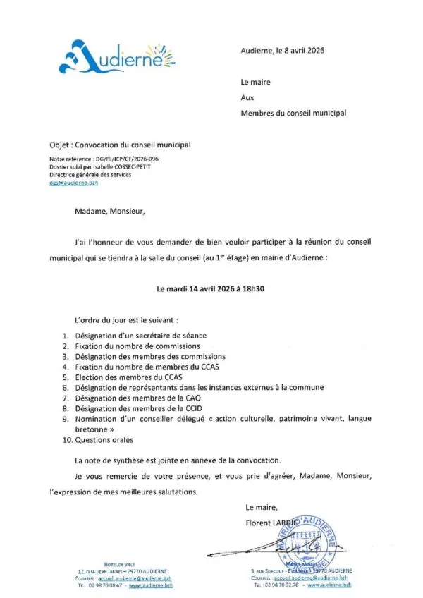 Le conseil municipal d'Audierne se tiendra le mardi 14 avril 2026 à 18h30 à la mairie d'Audierne.